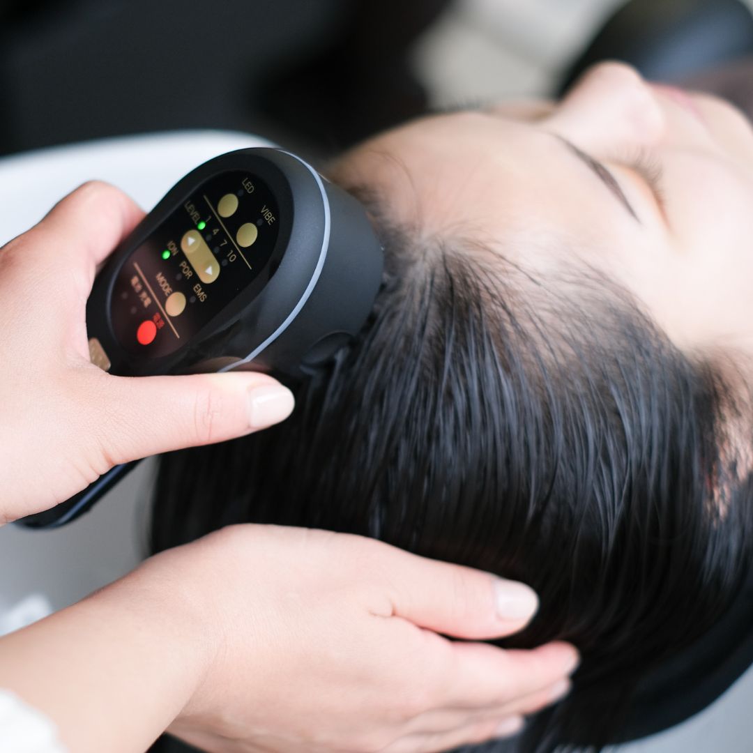 医師監修のヘッドスパを導入し、ヒト幹細胞培養液で髪と頭皮に必要な栄養を補給しながら、**EMS(電気刺激)**で血行を促進。エイジング毛のハリ・コシを蘇らせ、健やかな美髪へと導きます。
